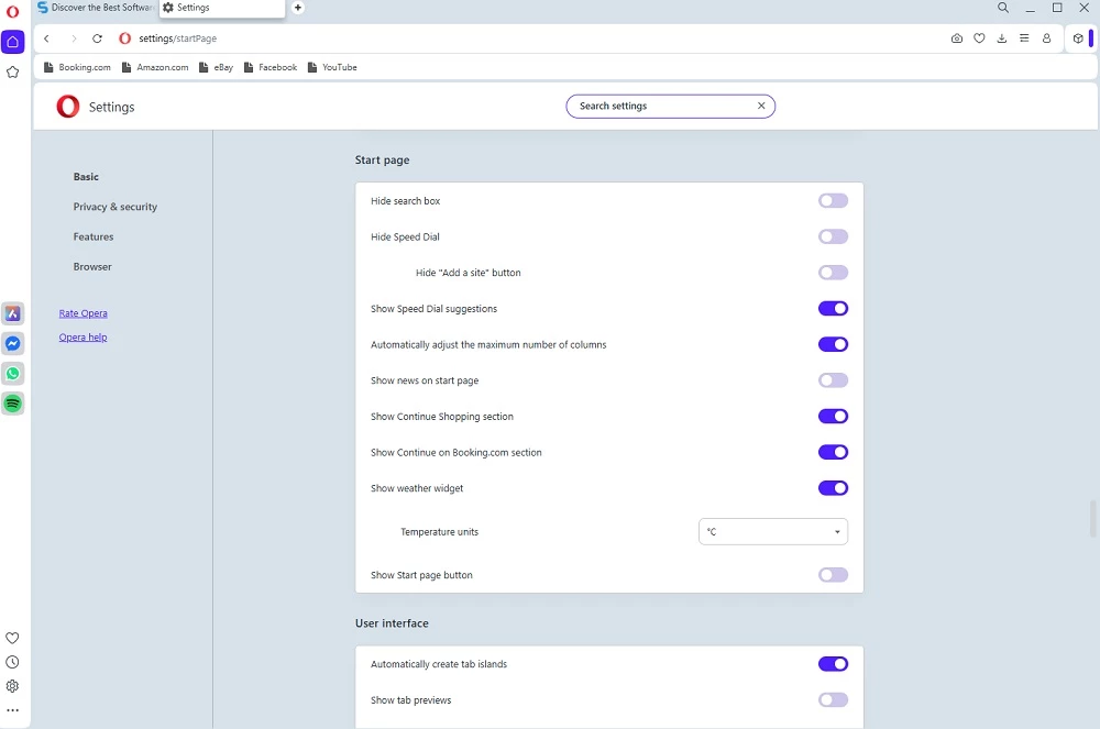 見栄えの良いインターフェースにより、オプションやメニューが非常にわかりやすくなっています。Facebook、Messenger、 WhatsAppなど、Operaの他のアプリケーションと連携するためのアイコンが多数配置された広々としたブラウジングエリア。優れたTableauは、サムネイルを整理することで、お気に入りのサイトや頻繁に訪れるサイトを提案してくれます。履歴の自動予測機能とメインの検索ボックスはGoogle検索に直接アクセス可能です。ブックマーク、履歴、更新ボタンはURLボックスの右側にあります。